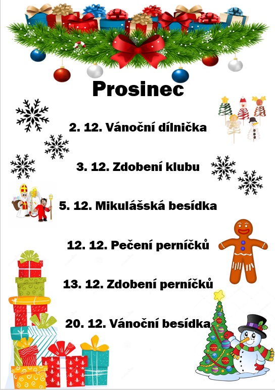 Připravili jsme pro vás vánoční dílničku a zdobení klubu, mikulášskou besídku, pečení a zdobení perníčků, a před Vánoci si uspořádáme vánoční besídku, kdy si pustíme vánoční koledy, které si společně zazpíváme a užijeme si krásné předvánoční odpoledne.