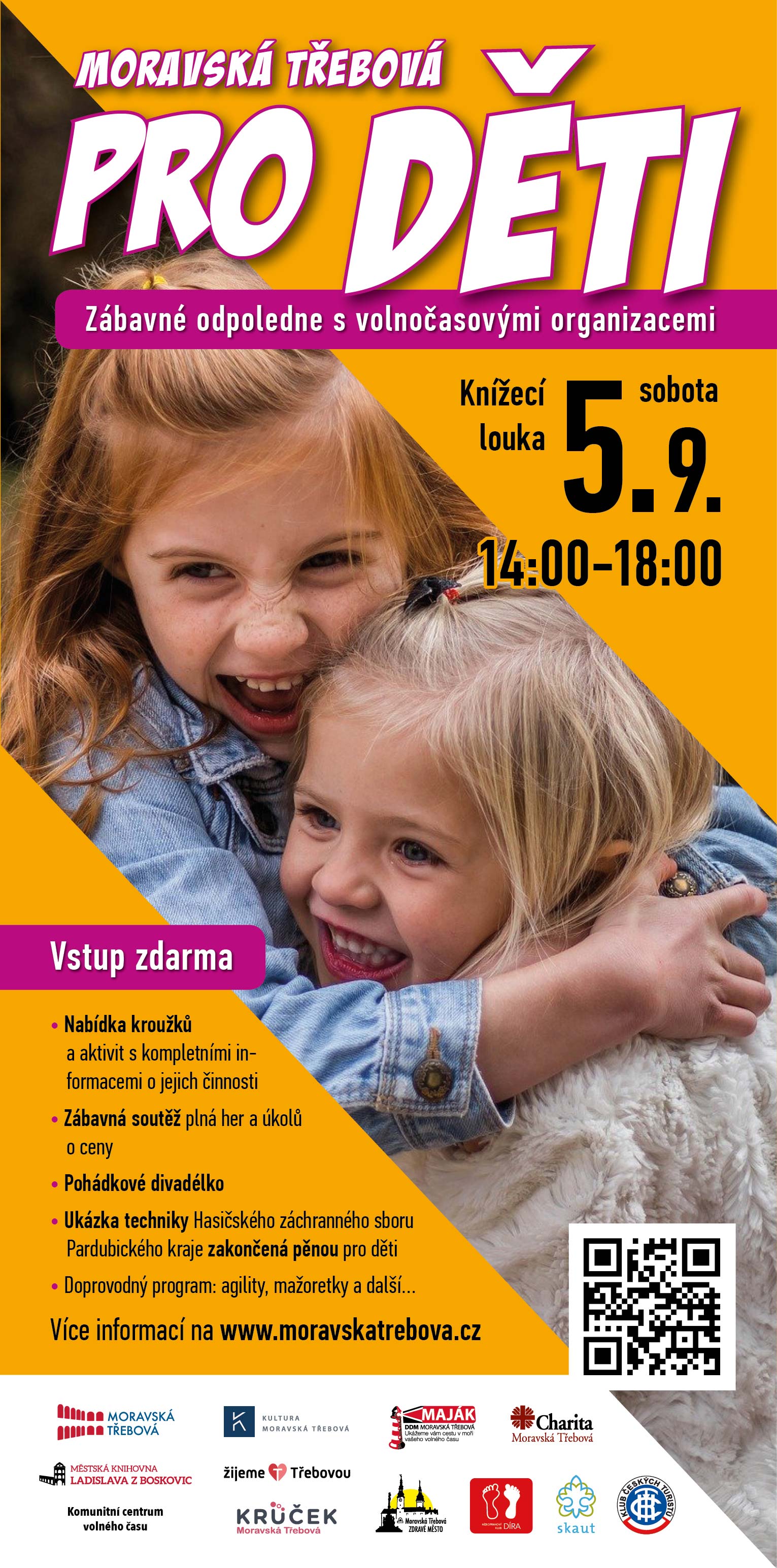 Nízkoprahový klub Díra Moravská Třebová se zúčastní akce MORAVSKÁ TŘEBOVÁ PRO DĚTI. Akce se koná dne 5.9.2020 od 14 do 18 hodin na Knížecí louce. Během odpoledne Vám budou představeny organizace, které Vám pomohou trávit volný čas smysluplně. Přijďte za námi a spolu si užijeme spoustu zábavy. Těším se na Vás ![]()
