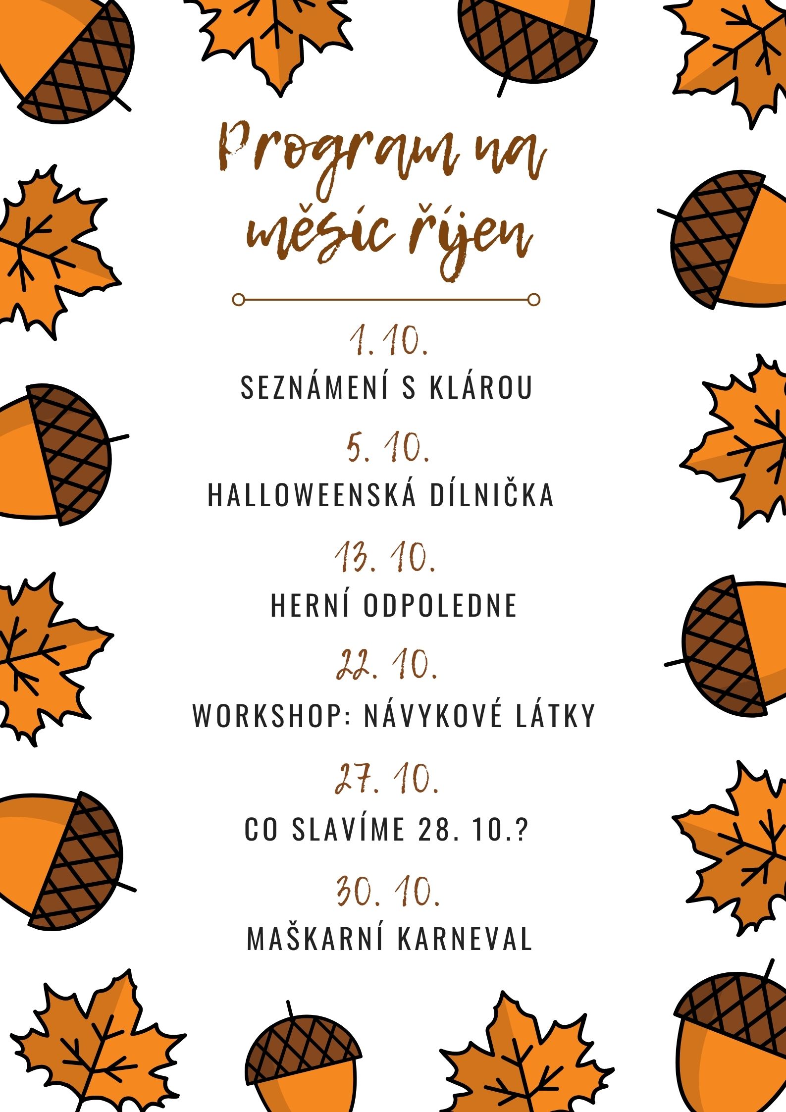 program na měsíc říjen je tady! ? Budete mít možnost blíže poznat novou pracovnici klubu Kláru, vyrobíme si halloweenskou dekoraci a zahrajeme si hry v klubu. ? Popovídáme si o rizicích a důsledcích užívání návykových látek a vysvětlíme si, proč slavíme 28. října svátek. ? V závěru měsíce si užijeme spoustu legrace na maškarním karnevalu. ?